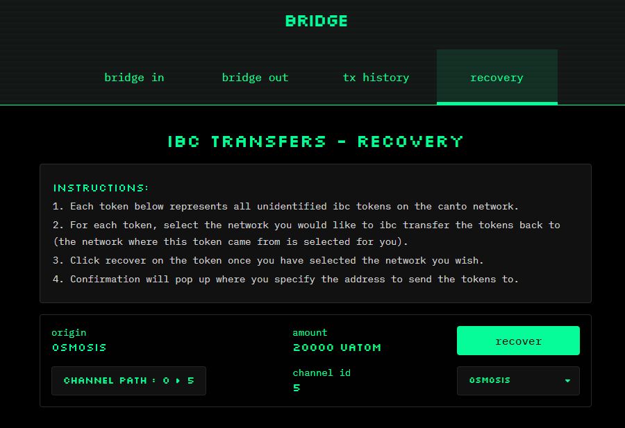 IBC tokens from Cosmos SDK chains such as ATOM, GRAV, and OSMO can only be bridged to the Canto EVM if they were transferred to Canto from their native chain. While the [**app.canto.io**](https://app.canto.io/bridge) frontend ensures this, *manual* IBC transfers may result in these and other unsupported tokens being sent to Canto.