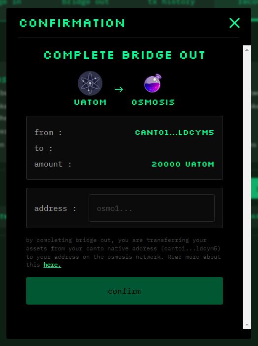 3. In the modal that appears, enter your address on the receiving network and click `confirm`: